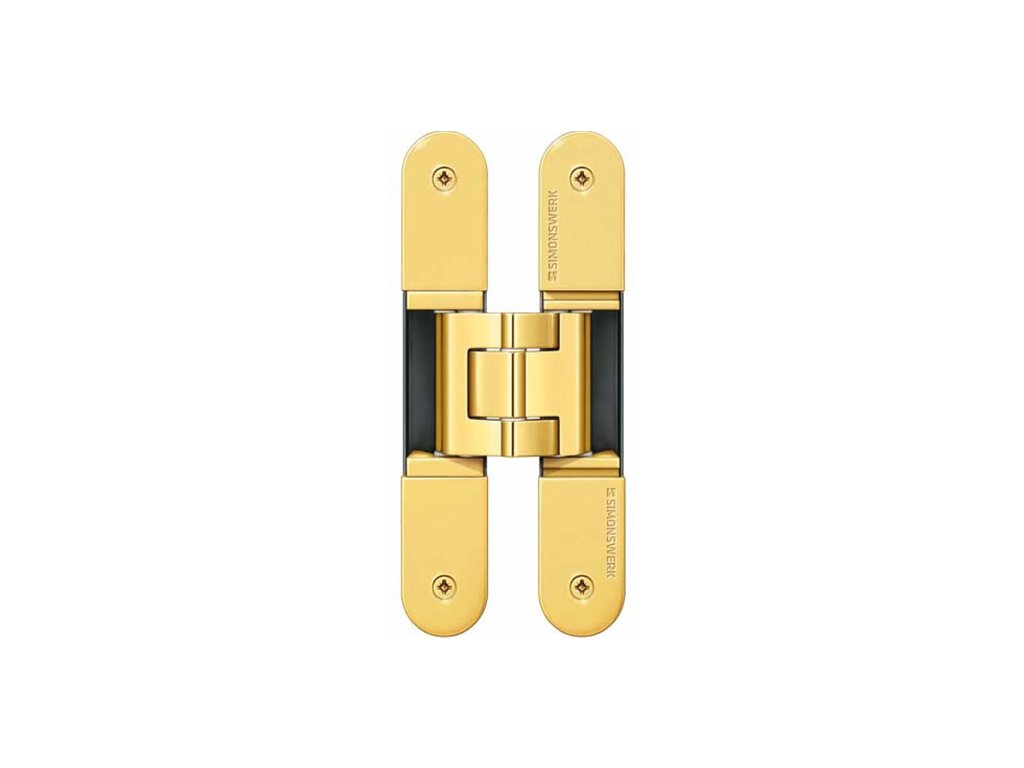 Zlatý dveřní pant vytvořený na míru pro skryté zárubně JAP 25/15. Pro klompetní osazení typové skryté zárubně jsou třeba tři tyto panty.